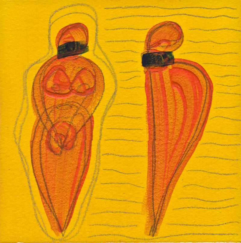 Colorful sketches as I move away from deep night colors.  I am twelve again, sunflower yellow drenches the paper and I see myself wrapped as a cocoon, unable to talk, unable to be creative.  She is into everything, and into my mind.  What I thought was closeness is unnatural.  She was a good mother when I was dependent upon her, but as I move into freedom and separation she becomes cloying, intrusive, and manipulative.  I am alone with her, brothers all grown.  “Pick up the knife, cut the chords, be yourself with your own voice, you are pregnant with your sexuality and creativity, and creativity is your path.”  Is the knife my pregnant self or is the knife the tool to bring the creativity forth?