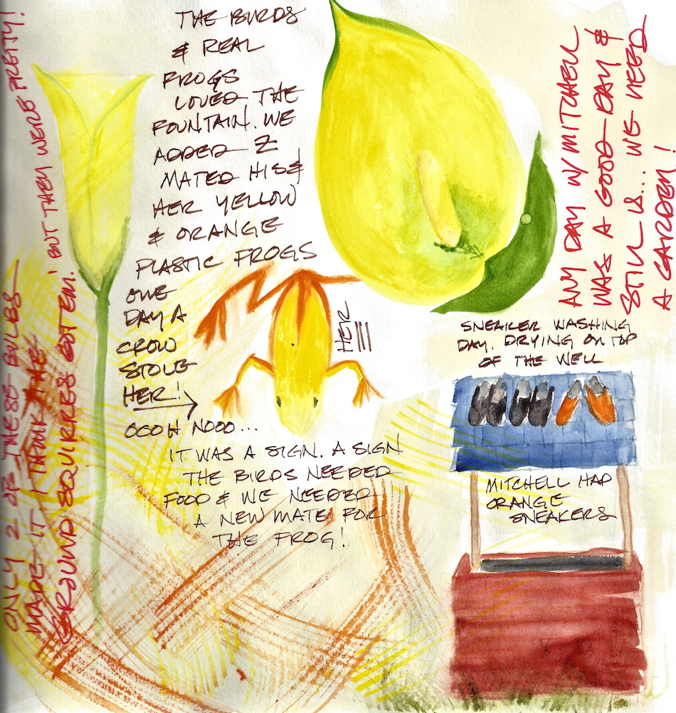 I painted from memory and photos of my husband and I in our last garden. Plastic frogs, real frogs, birds, crows, his sneakers drying on the well roof, yellow flowers, garden buddha, saying prayers and pujas outside, all fond memories. And I am cheered this evening, much better than when I started the day. Happy Sunday!