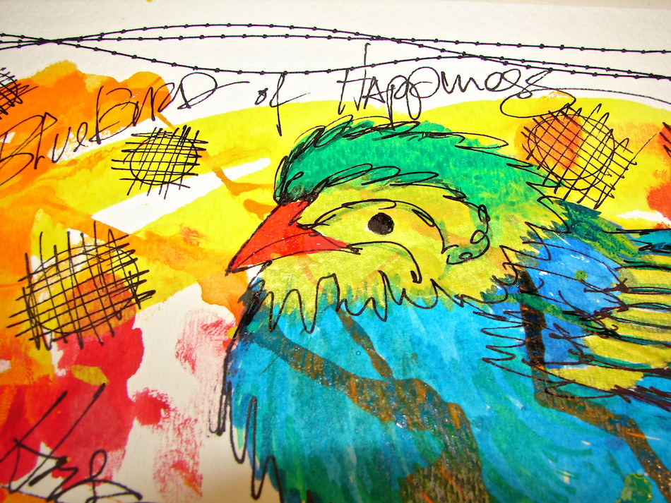 Then Jeannette House had a bird she wanted painted, but I still had Dina Wakley in my head, so while I will try Jeanette’s bird her way, I also did it in the spirit of loose and bright and made-up!  Fun, lose, lines, yay!