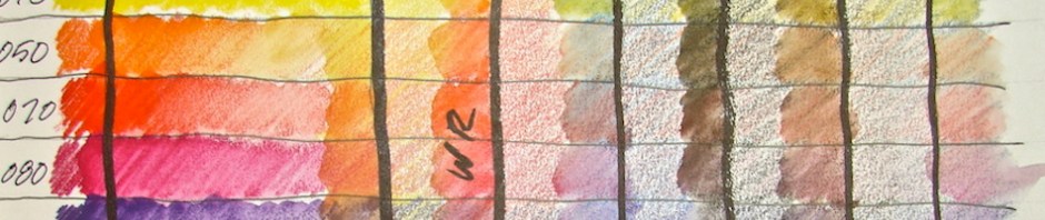 They sit on the page and are pushed by the brush (image 3, above), instead of acting like watercolors or Caran D’Ache Neocolors II, which I have in my travel case, and use — I like the way Neocolor II color distributes, as it is can be manipulated much more like a watercolor.  In fact, it is easy to pick up Neocolor and use it like watercolor in a pinch.