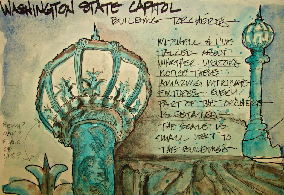 I bought a few more Primatek (Daniel Smith) watercolor paints from Merriartist; they are having an amazing sale on watercolors this month (ask for the sale code.) I had to play with them, of course, and think I have fallen in love with two I would not thought I would love. I bought them to use in buildings, for marble and brick color, but they are both versatile. The first is Piemonite Genuine, from Piemontite, from the Prabornaz Mine, in Saint-Marcel, Aosta Valley, Italy. Above, what it does when mixed with my traveling palette is amazing — creates rich colors with depth, and surprising effects.