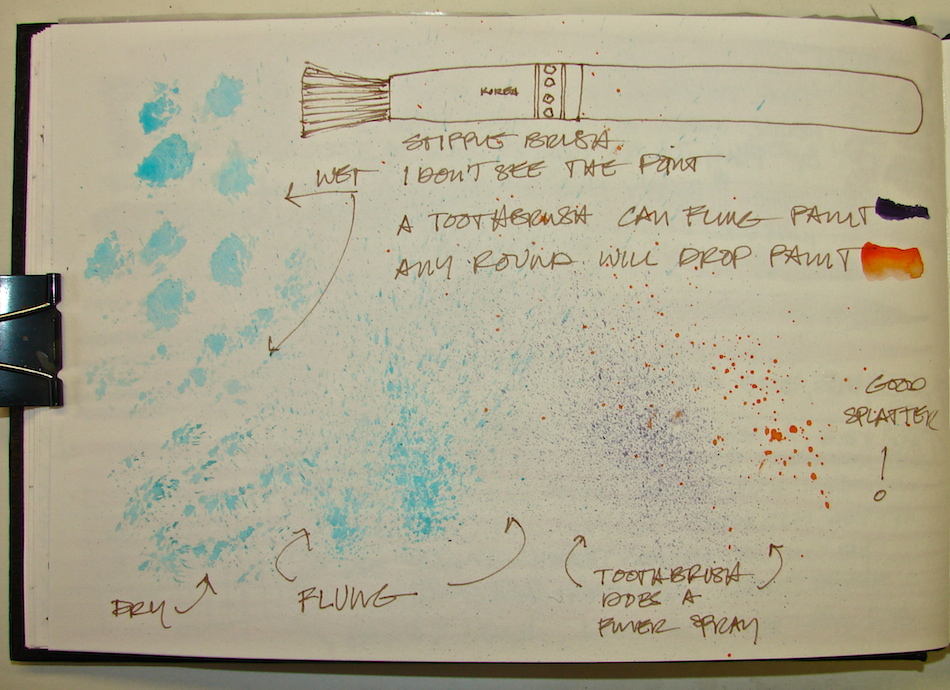 I searched for it in my box of things not used. I tested it with watercolors. The stipple brush with fairly wet watercolors (upper left cobalt turquoise paint splotches)looks a bit like a footprint. Stipple works so-so with the dry brush straight up (lower left turquoise paint). Turned on its side and flung with my thumb did a good spray pattern, but why? A toothbrush works well (finer spray in purple), and a #8 round (orange paint) taps out a nice pattern. I use the rounds and splatter large drops, and rarely use the toothbrush.