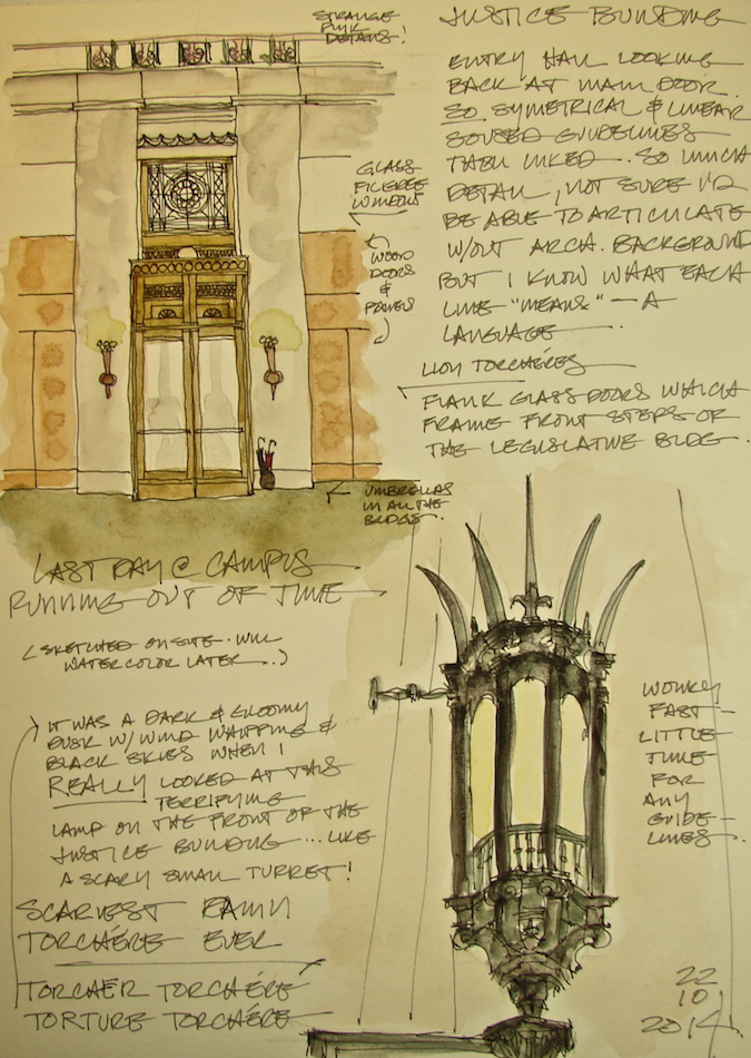 My last image sketching onsite, this from the Washington State Capitol Justice Building. Scary torchéres!