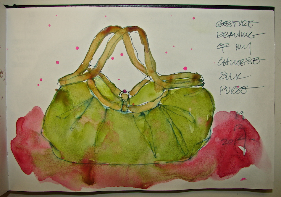 I have two bags I reach for besides my painting bag. One is this lovely silk Chinese bag which never lasts more than a season — the material and construction is not meant for ever after. These purses are bright, beautiful bursts of color and i buy them in Spring and they last until autumn.