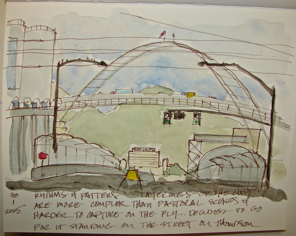 Annoyed, I finally decided to try layering the cacophony all at once without thought to shapes to see how that would work, and gave myself 15 minutes. No what’s in front and what’s in back; no set-up and figuring. Just draw a giant gesture of the crazy jumble of lines. I started with the gentle arch of the bridge and then the tall arches, then moved to anchor each side of the page. It totally worked to loosen me up and relax me.
