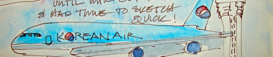 “Taking Delta all the way.  Pretty good for airport food . . . and pretty healthy.  Wrap with hummus lettuce onions.  Mik’s “salad” w/ feta, chicken, cabbage.  4 hour layover which I took so we didn’t have to sweat missing the connection.  I waited until Mik got back and had time to sketch.  Sky blue Korean Air.  [Here is the] Obligatory plane [sketch.]  Turned out to be a gorgeous color making me want to draw.