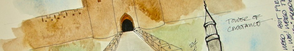 From my journal: “We stopped by the commune of the Aigues-Mortes (stagnant or dead water) on our way back to Marseille . . . Our poor French has us wondering if this castle/fort was really built before the birth of Christ. Part of the canal system (Canal du Rhone a Sete) enters through a wall. The outside left me cold. (Does it show in the drawings?) But on the inside is a bustling lively city with eateries, markets, etc. We had a light lunch of some sort of sandwich-bread-cheese concoction.”