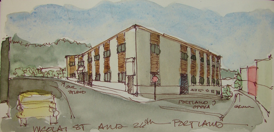 I am often in the studio by 5am. We don’t see them coming back unless we are at the studio very late. I stood in front of their studio entrance to draw this view,