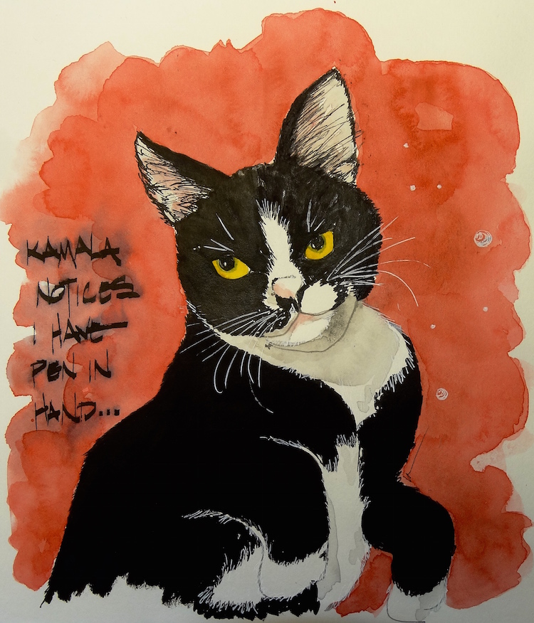 Kamala is the most difficult cat, so smart, and does not want her image captured. She seems to know when I am studying her for a sketch, and moves away into a cozy box.