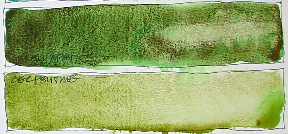 I was methodical, adding the same number of drops of water to both palettes, so density or thickness of the paint wasn’t an issue.  The Sennelier mixes into unbelievably dark flat colors, crayola colors, which is fine in a waxy crayon but not what I want in watercolors.