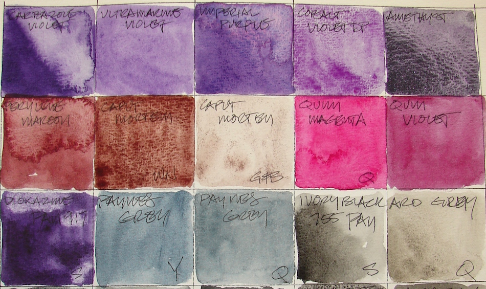 Greenleaf & Blueberry Caput Mortem is not the Caput Mortem I want (which is DS Caput Mortem, much less purple, and also discontinued, far right.) I am bringing together all the Caput Mortems, even though I put the DS version into the brown posting because it really has no tinge of purple.  Windsor Newton Caput Mortem, PR101, is an intense mauve that I really hate…. but I had to try it to see if it would take the place of DS.