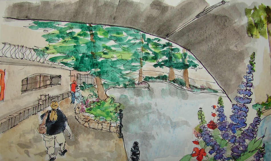 Thanks, Dan. On these virtual sketchwalks (ggle maps and wiki images and friends photos) I mostly play with layout and in this one I wondered if I could portray the sensation of coming out from under one of the dark bridges into the colorful riverwalk.