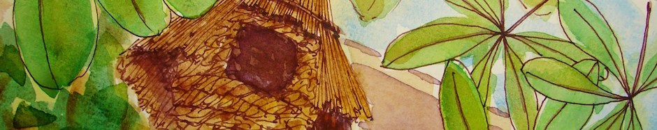 I choose the ink because of the purple in the leaf stems, which you can’t see easily in the image.  I love working with colored inks under watercolors, which Reuven Dattner inspired me to try from the beginning of playing with watercolors.  I also used a diluted wash of the Australia to hint at the apartment building behind the trees.