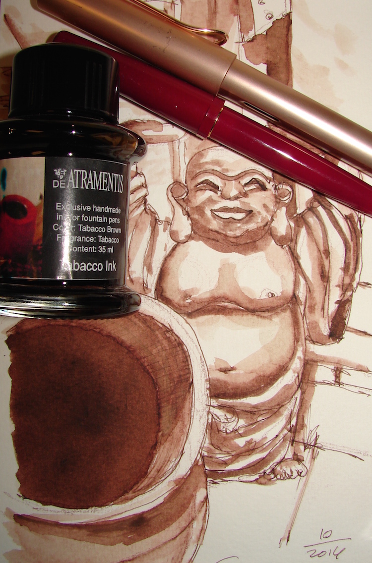 De Atramentis Tobacco ink (scented) is a lovely earthy dark brown with charcoal overtones at its deepest (the inside of the pot) moving to a reddish brown when diluted. The smell of it takes me back to Pa’s pipe and Christmas at the ranch.