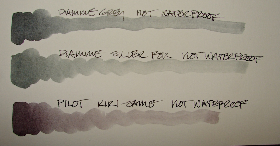 Diamine Grey, Diamine Silver Fox, Pilot Kiri-Same sample sizes from Goulet.