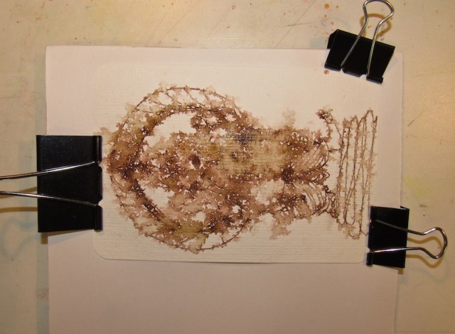 Paper curling IS a problem with tons of wash, but its a small one. The Ganesha above I sprayed to move the Tobacco ink sketch, and it curled. I haven’t cut a good base, but the paper behaves when it is clipped. If you don’t or can’t clip it when you are working it, AFTER it is dry, turn it over and clip then brush with water and let it dry. It straightened out the teabag art and the Easter colored tulips below, which curled!