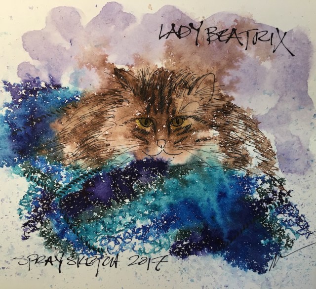 Oh, I like sassy cats! This is great–I do love the water spray. You do so many really cool things with your painting.