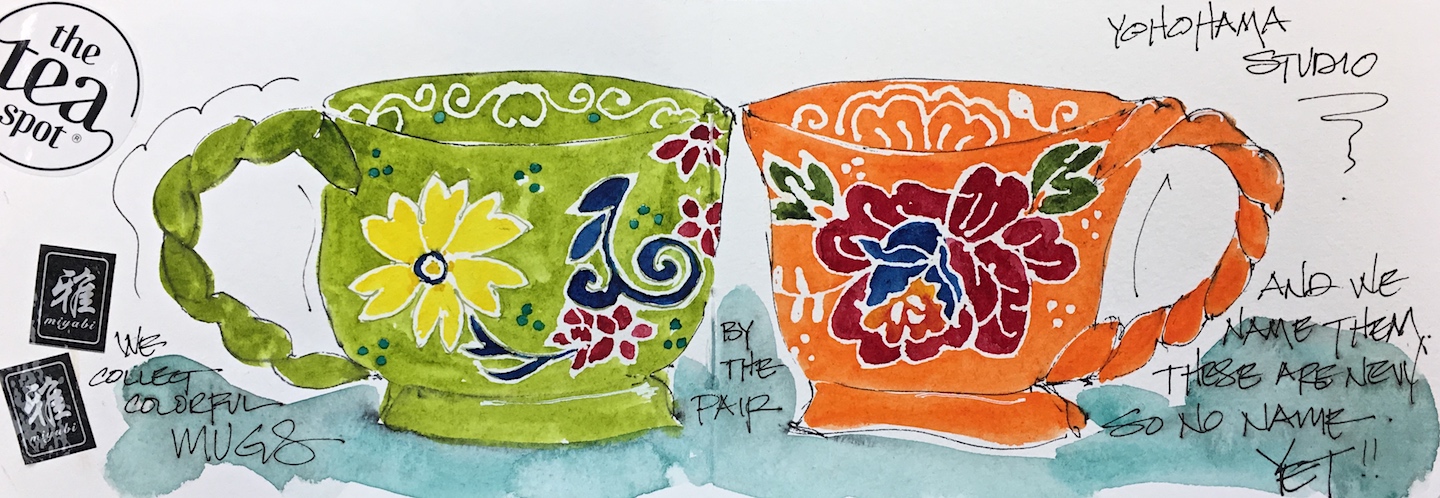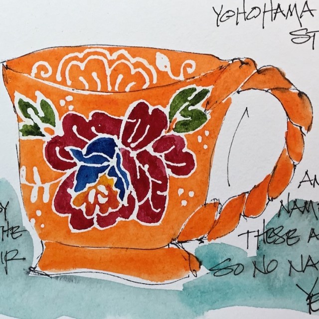 Above, the cup lines were drawn with Diamine Grey, not waterproof, because