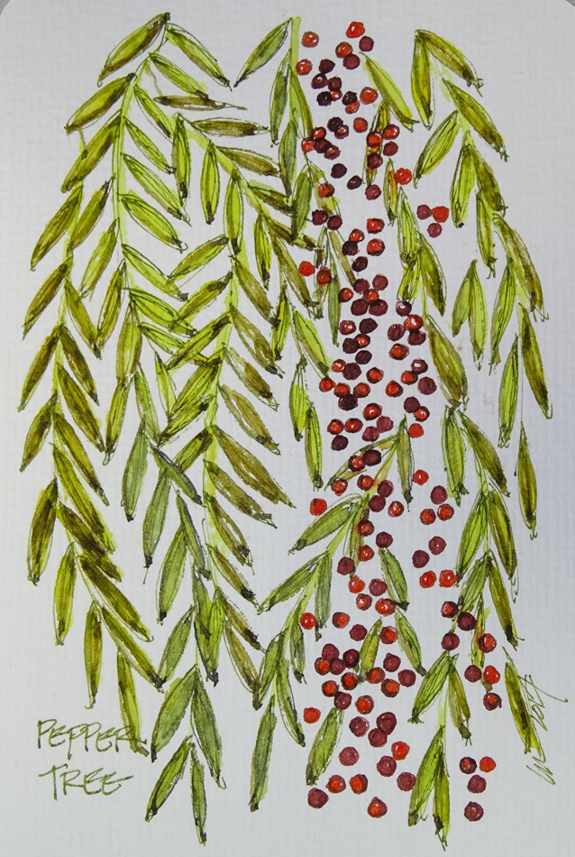 I don’t recall ever seeing a Pepper Tree in art! Your long, trailing leaves, and pepper corns watercolor postcard is lovely!