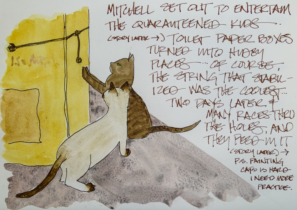 Super5 Frankfurt, Noodler’s Lexington Ink, Platinum Preppie pen with De Atramentis Document Brown ink, Platinum Carbon Pen with Platinum Carbon ink waterproof cartridges, Liquid watercolors in Pentel Aquash Water Brushes.