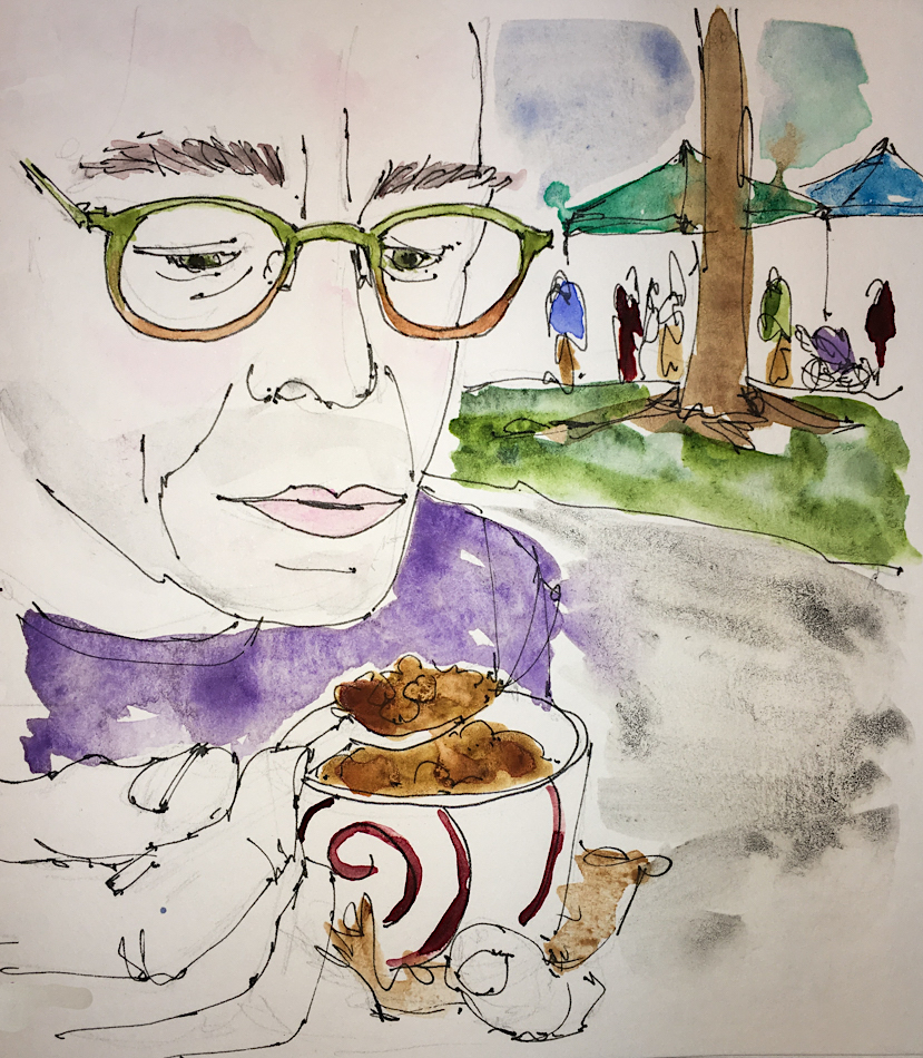 Platinum Carbon Pen with Platinum Carbon ink waterproof cartridges, White Uniball Signo, Sennelier, Holbein, Primatek watercolors and Daniel Smith Watercolors.