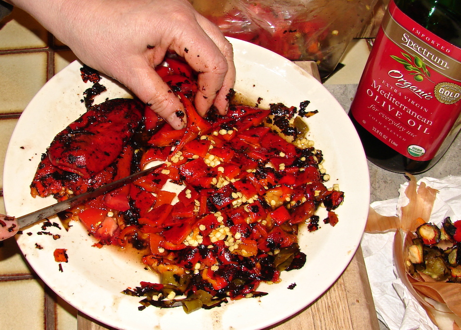 Broil 1-2 hot chilies (as hot as you like, but this is not a recipe for scorching your mouth).