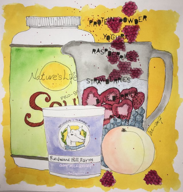 We no longer use any kind of juice, which adds to your sugar intake and is unnecessary. Goat yogurt, fruit (frozen or fresh), Nature’s Life organic soy