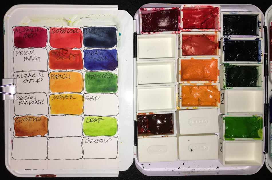 One is that there is a inexpensive palette that I bought from Amazon called Prima… nothing fancy, the colors are student grade, but they are not bad little palettes and I can get 12 full pans in one and there are two mixing wells. I like the tropical… I gave the paints to a kid I know and enjoyed the palette so much I bought another.