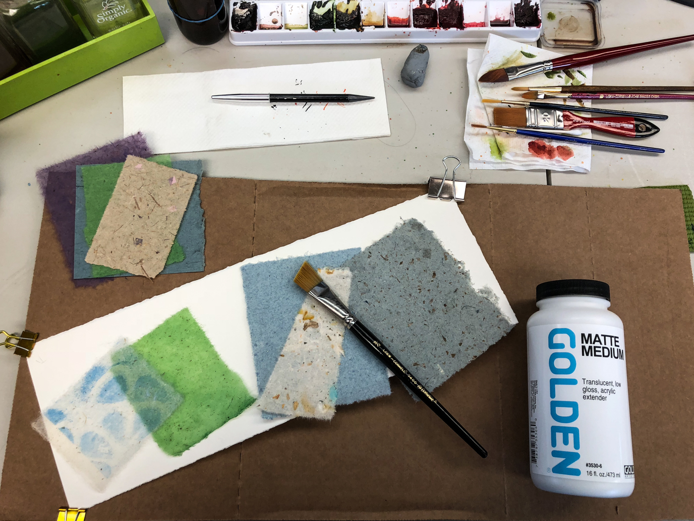 I get a feel for what I want to use and tear or cut the shapes and lay them out before I begin layering with medium.  I use nothing but Golden acrylic products.  ALWAYS.