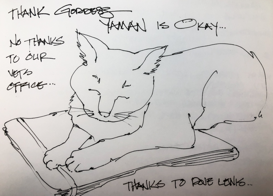 Monday morning we thought that Hari had gotten into a pill that had been crushed under my chair wheels… One that could kill him or make him very sick at least.
