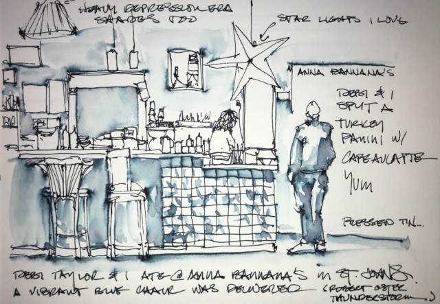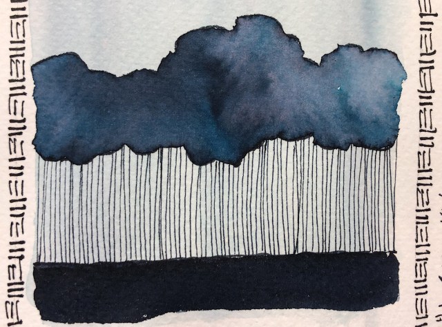 My “thunderstorm” was drawn with a Lamy Vista with a 1.1 stub nib, on cold press watercolor paper. The cloud edges were touched with water using a Pentel Aquash waterbrush. The lines quickly lose themselves in wet color;