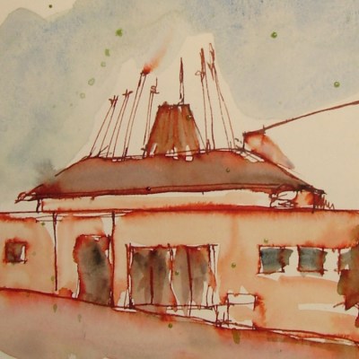 The ink was one of my favorites to have in my purse in case I had time to sketch in the city. This sketch of the Native American Student Center in Portland was created in ink. Later a wash of Daniel Smith Lapis and Hematite was used when moving the ink.