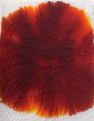 sheen when laid in thick, above. when doused with water on a towel, the only color that slightly pulls is yellow.