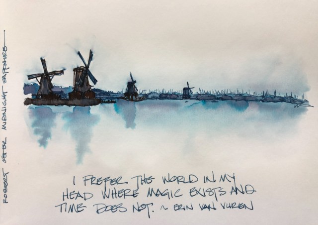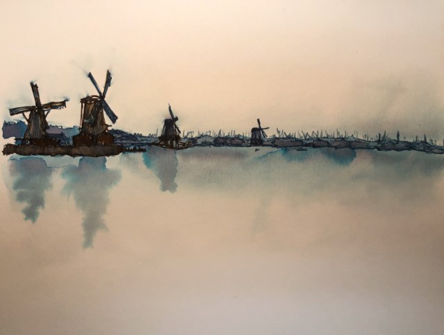 Over the dried ink wash I moved across the horizon line, adding lines for the various windmills and trees and such. I used two colors, the Robert Oster Midnight Sapphire, and then to warm the banks and wooden structures, Robert Oster Aussie Brown ink.