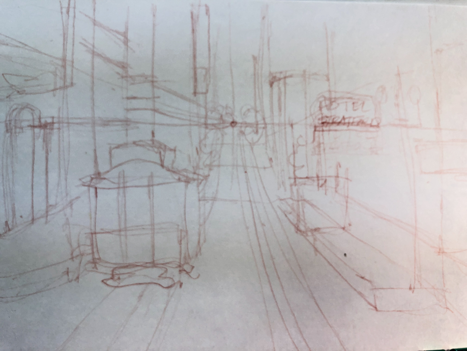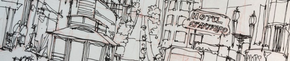 I loved returning to regular sketching with a fast one of one of my favorite views in San Fransisco. cable cars. When I was in college and early 20’s I stayed at the Stratford Hotel.
