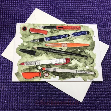 I love your collection of pens and your illustrations of them. Lately, I’ve been using my favorite Lamy to write in my Apica C.D. NOTEBOOK. The paper is designed to perfectly receive fountain pen ink when writing text. Such flow! In script, the cover reads: “Choose the paper like you would a good pen.” As a writer, I love this elegant book.