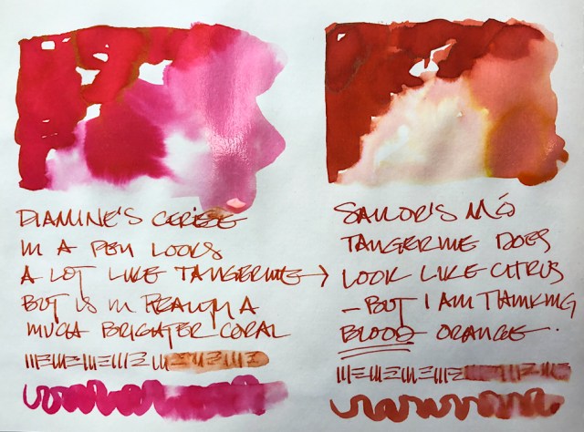 The serendipity of using two orange inks in my 1584 Journal, I began to think they were very very similar. But when I swabbed the inks, below, I could see differences. Diamine is brighter and leans pink, while yellows appears in the Tangerine. I am enjoying this ink, but will not lament it when it is gone — when the smell is factored in, it is not a nice as other orange inks. Below I offer some comps, from my favorites, Pumpkin and Orange Zest, to warmer Robert Oster oranges.
