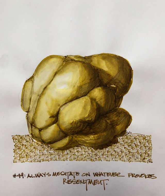I love this slogan because it is a key to getting clear and more conscious and aware. Whenever I feel irritation, fear — especially that type of fear that is in the future, not so much someone coming at you with a knife — or hopelessness, it is a cue for me to stop talking or reacting, and to listen to the other person. If I can greet problems as opportunities to learn about myself and another person, I might be able to find a way to connect and certainly it will lower the anger level. I might garner compassion for the situation, or them, or myself. Those trigger feelings become ways to look inward.