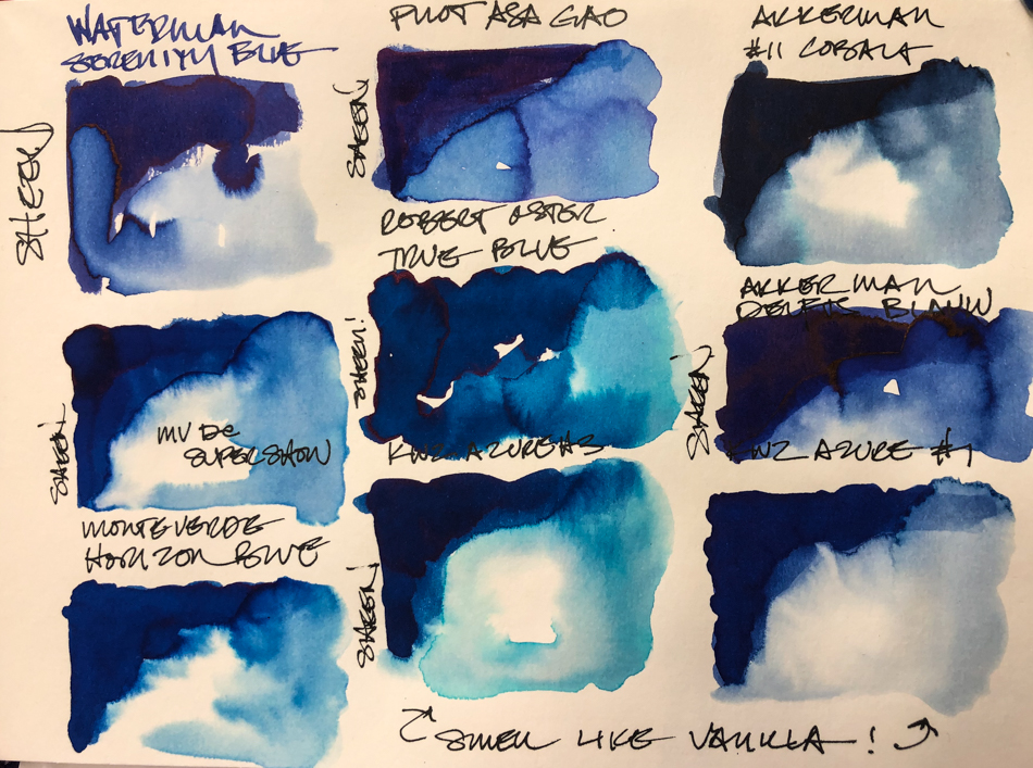 center is my new Robert Oster True Blue ink: delicious, heavenly, wonderful, sheening, all blue with no surprises. I love blues that move into other colors