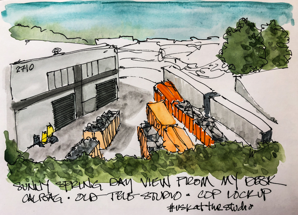 Anywho, I haven’t done any urban sketching at home but I did at the studio, above and below. Above, the view from my computer desk, which I’ve sketched