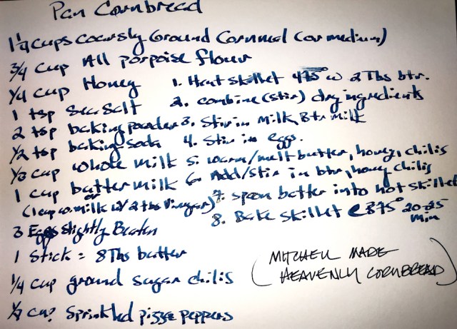and diced avocado and corn bread the first day (Mitchell’s recipe below),
