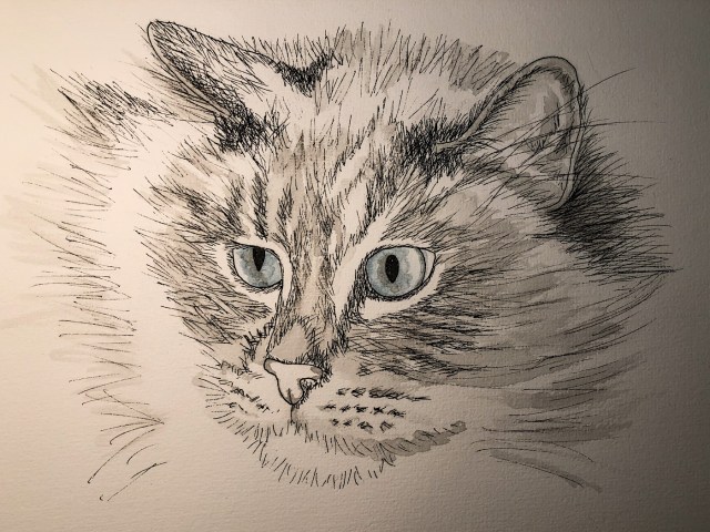 Beautiful drawing/painting–you captured the cat so wonderfully. The overall style reminds me a little of some East Asian paintings that I have seen.