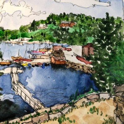 Ink/watercolor combo is shown above in an image of the Pitt Museum in Portland.