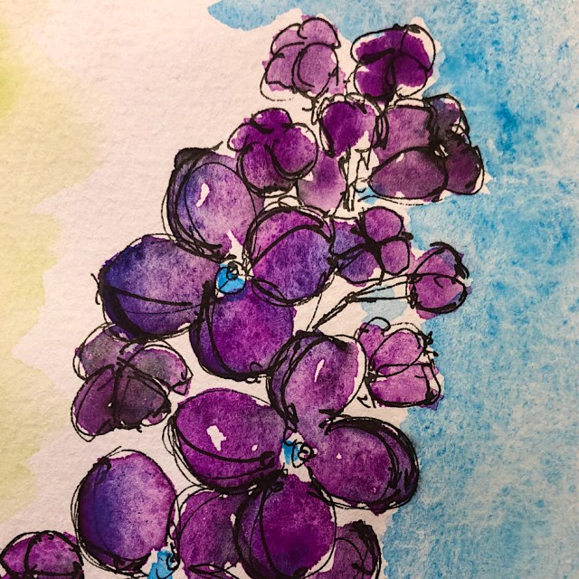 the bright purple-pink watercolor and fresh green leaves…
