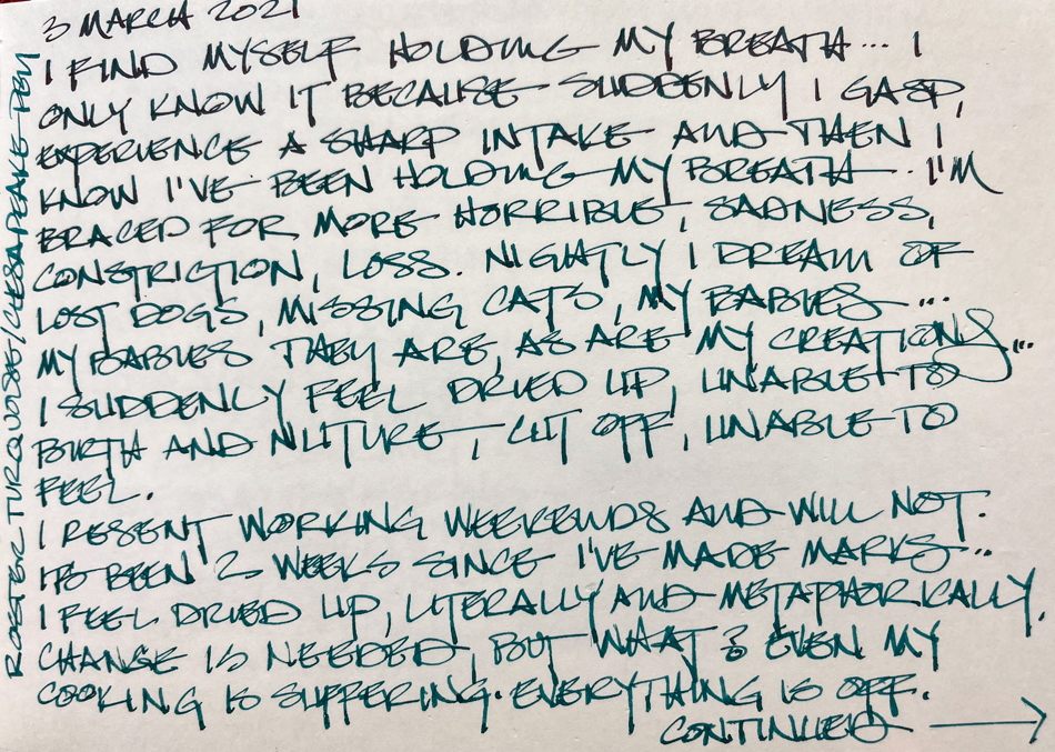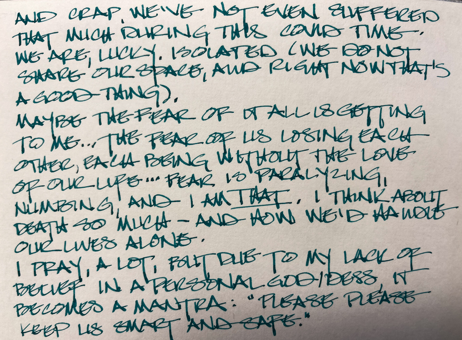 Hi Kate, you’re not alone, reading your journals felt good in a weird way, your worries, fears, sadness, brain shutting down, creativity loosing it’s sparkle, even the nightmares, it all sounds too familiar. All we can do is hang in there. Out here in the Netherlands next week the pubs and shops will open with restrictions, and the curfew will end, even though the hospitals are leanings towards code black during this third wave. I don’t feel save walking outside but my body and brain needs it, it feels like war with an invisible enemy. Take care, hugs, Shirley
