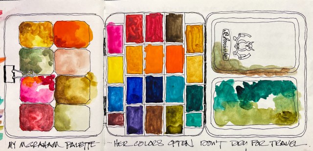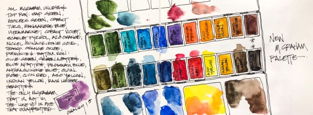 Recently I reorganized my palettes, and the M.Graham was moved into a smaller Schminke palette. I still find MG watercolors a bit stinky, but remember I returned the following pigments out of my palette and that stopped the headaches: Sap Green, Olive, Hookers Green, Anthraquinone Blue, Cobalt Violet, Raw Umber and Transparent Orange Oxide (*sob, lovely transparent oxide!*).