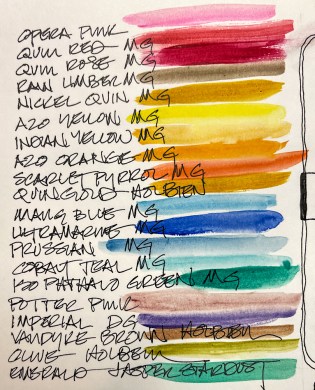 Imperial Purple (Daniel Smith, and one of my all-time favorite purples), Potter’s Pink (given to me to try when mixing skin pigments, which I initially said, yuck to but I have used it!), Quinacridone Gold (Holbein), and Opera Pink (Daniel Smith).