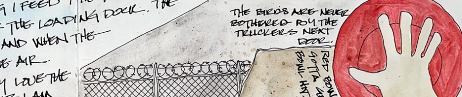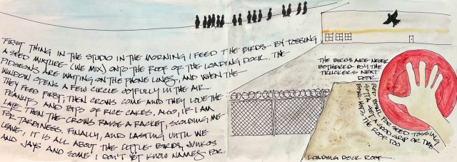 “First thing in the studio in the morning I feed the birds by tossing a seed mixture (we mix) onto the roof of the loading dock. The pidgeons* are waiting on the phone lines, and when the window opens a few circle joyfully in the air. They feed firs; then crows come and they love the peanuts and bits of rice cakes. Also, if I am late then the crows raise a racket scolding me for tardiness! Finally, and lasting until we leave, it is all about the little birds, the junkos and jays and some I don’t yet know names for…”