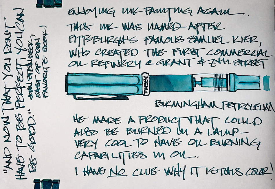 Birmingham ink is named in honor of Samuel Kier, who erected America’s first commercial oil refinery near downtown Pittsburgh’s Grant & 7th St. He produced illuminating oil (for lamps) from petroleum. Although “coal oil” was well known at least as early as the 1700s as a byproduct of making coal gas and coal tar, it burned with a smoky flame that prevented its use in lamps. Mr. Kier had intermittent contact with Edwin Drake regarding his oil experimentation, as he shipped crude to Pittsburgh from Tarentum, north of Pittsburgh. Left, you can see the older version of Petroleum versus the new one — and I like the new one MUCH better!