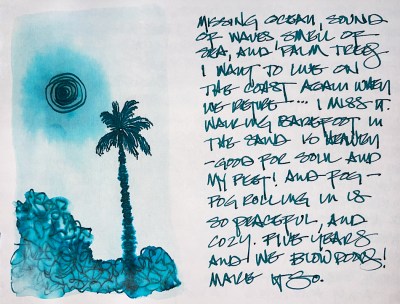 It is a well behaved ink which dries relatively quickly. It feathers slightly on Post-its (many inks do as it is cheap paper), but is fine in my Hahnemühle Nostalgie journal (see palm/beach images below) and on Hahnemuhle’s Hemp paper (below)! It is beautiful on watercolor paper, above. When I scrubbed it, top, it showed quite a lot water resistance (to the right), and further test sketches in my journals show it to leave a good imprint of water resistant ink lines when the waterbrush moves the color. It has no sheen that I could produce, and is not a strong shader with my 1.1 stub nib, but when painting it separates so I consider this a complex ink color. When the edge is touched with water it moves easily.